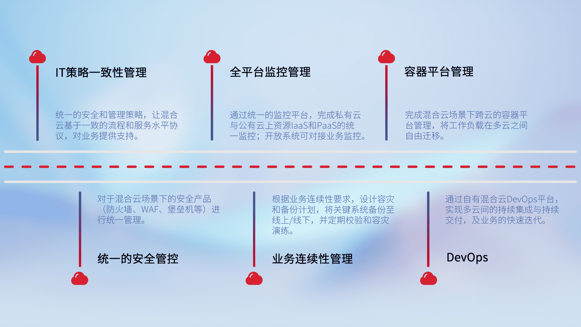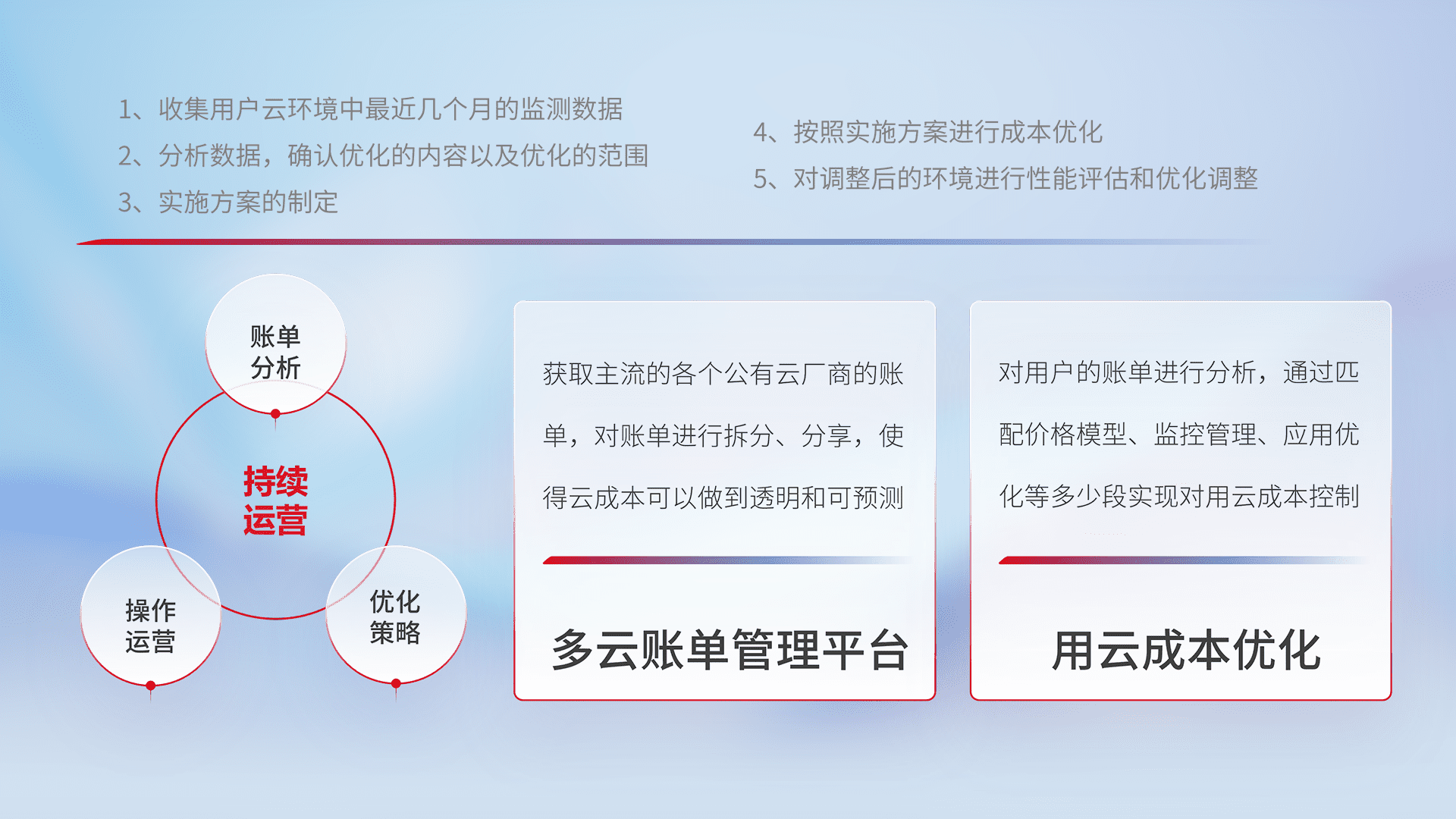 通过多云纳管,,,以统一的资源数据模型把客户的云资源进行抽象和封装,,,,进而实现对多云资源的统一操作,,保障云资源管理的可靠性、、稳定性与可用性。。量身定制化运维内容,,,配置、、、、开发运维、、、、补丁管理、、、备份、、、、监控、、认证和访问管理、、审计和日常巡检等,,,,保障在用云过程中的可靠度,,稳定度以及高可用率。。。